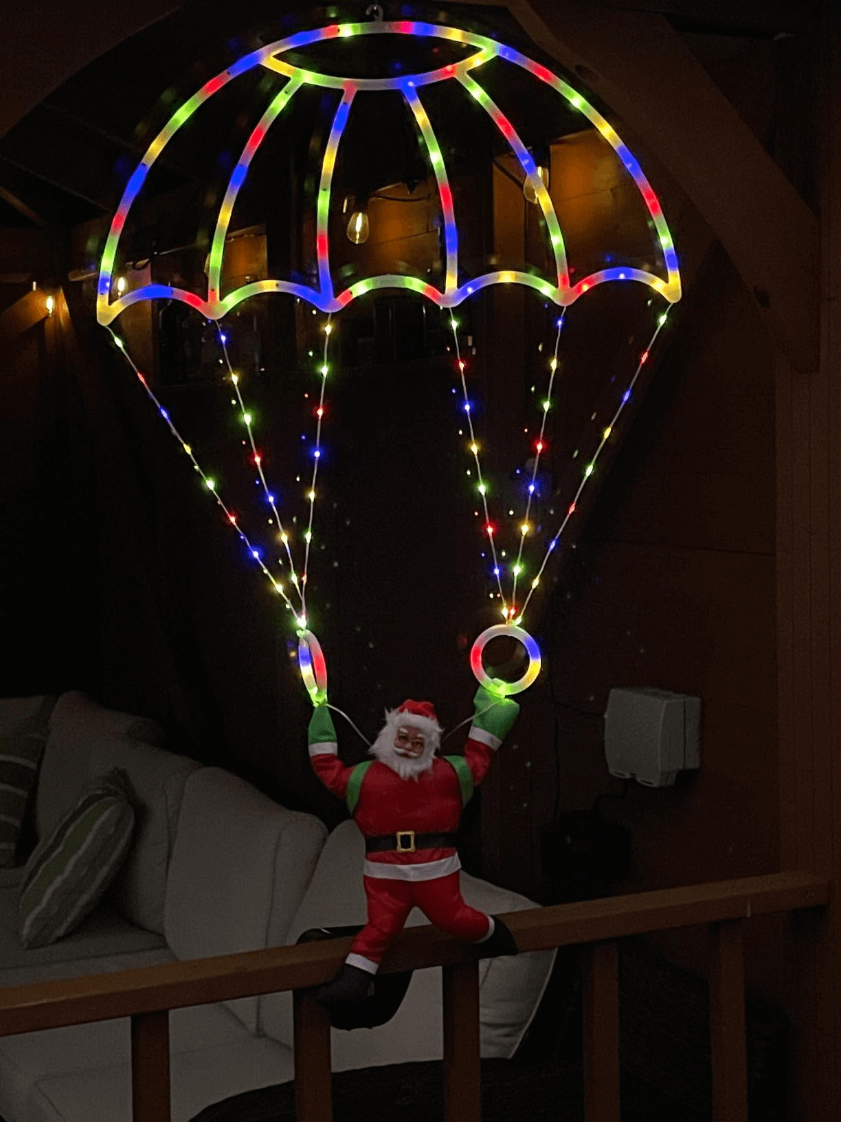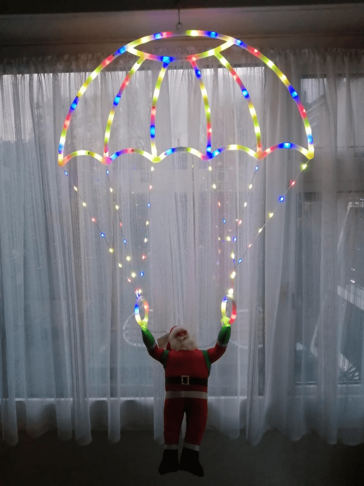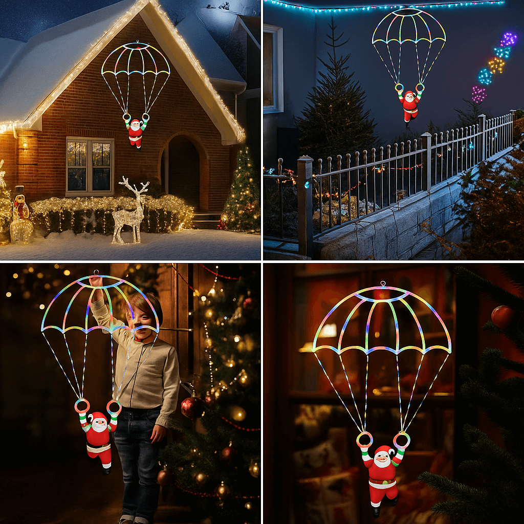 👉 Diseño: Papá Noel colgante con paracaídas iluminado.